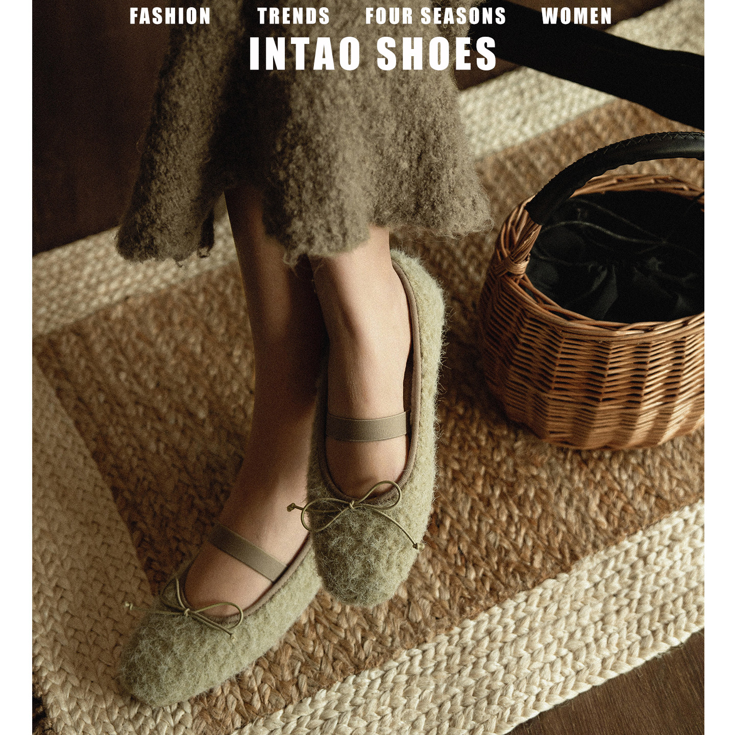 法式绿色玛丽珍毛毛鞋女冬加绒保暖平底棉鞋蝴蝶结温柔一字带单鞋