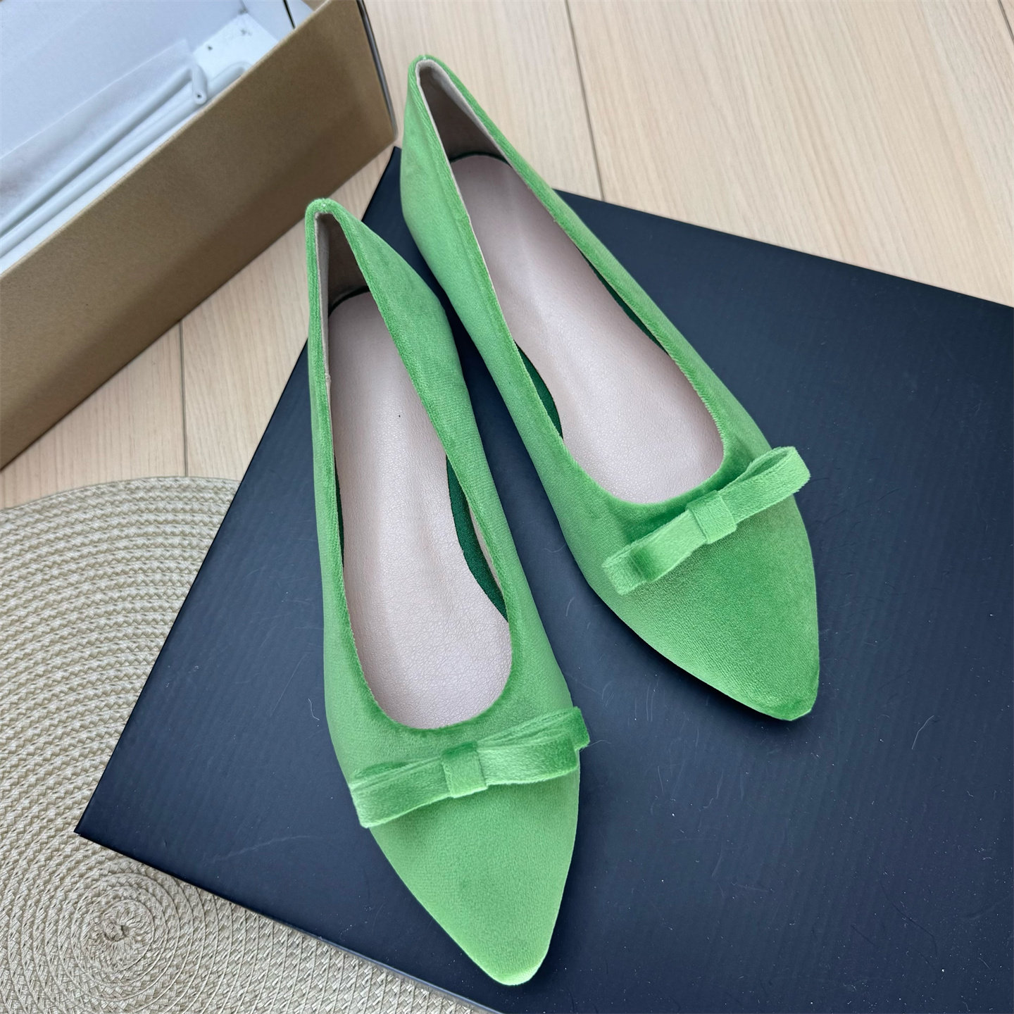 2026春新款法式尖头浅口单鞋女绿色蝴蝶结平底鞋一脚蹬百搭芭蕾鞋