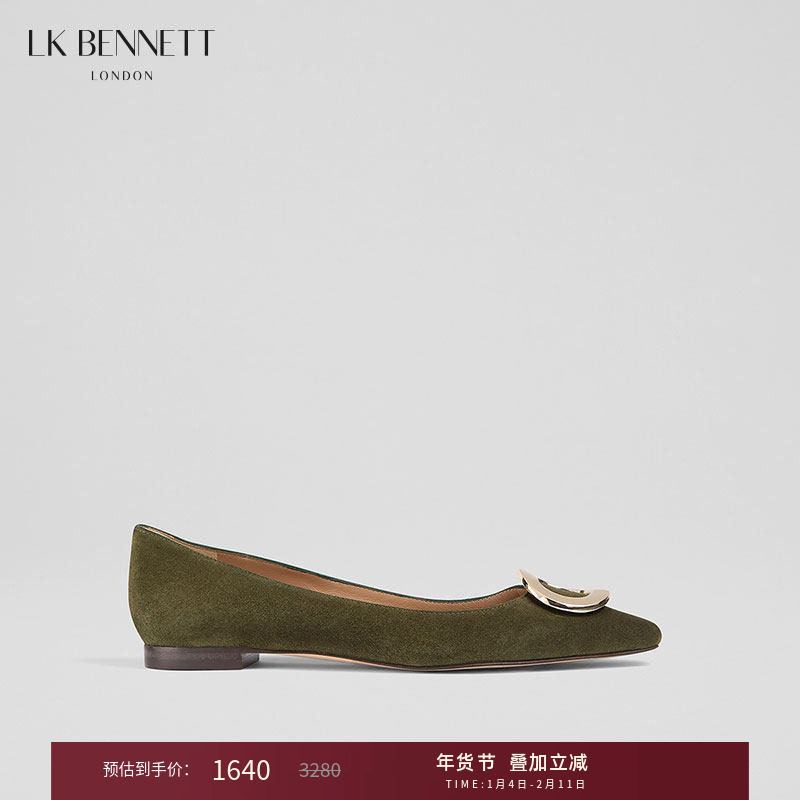 lkbennett深绿色绒面单鞋2024年秋新款平底时尚金属装饰女鞋