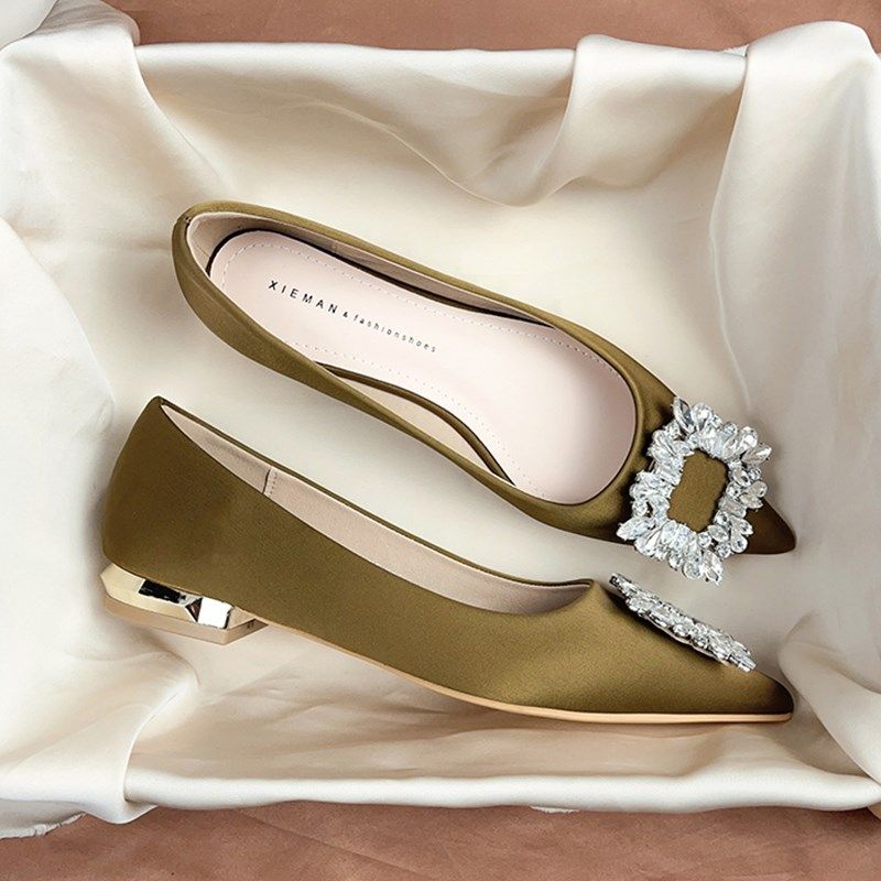 气质水钻绿色平底鞋2024年夏秋新款法式缎面浅口单鞋女设计感小众