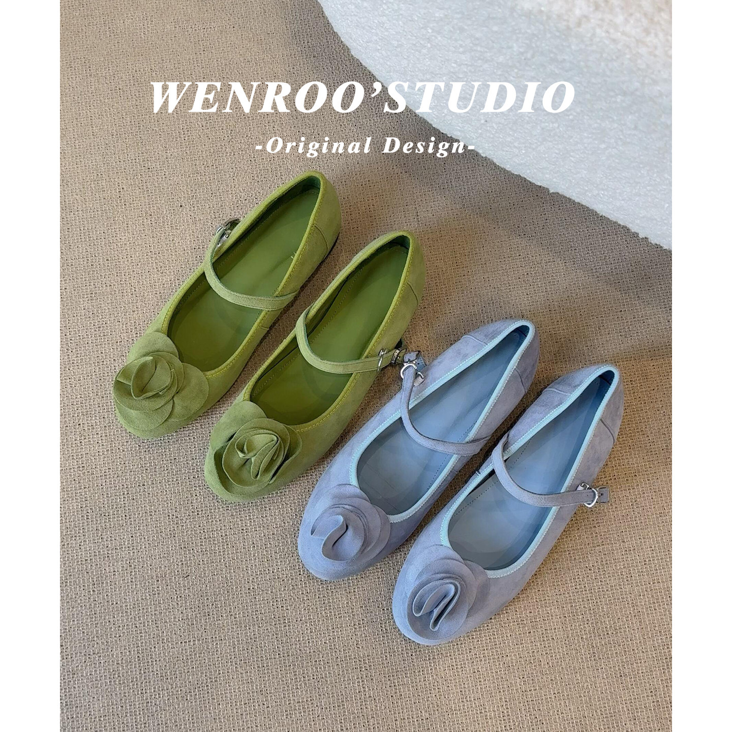法式玫瑰一字带浅口平底玛丽珍鞋女2026春季新款绿色气质芭蕾单鞋