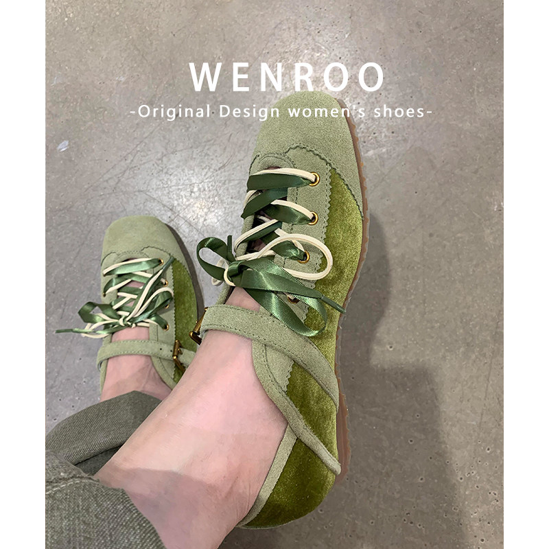 绿色复古绒面芭蕾舞风德训鞋女2025秋季新款小众系带休闲平底单鞋