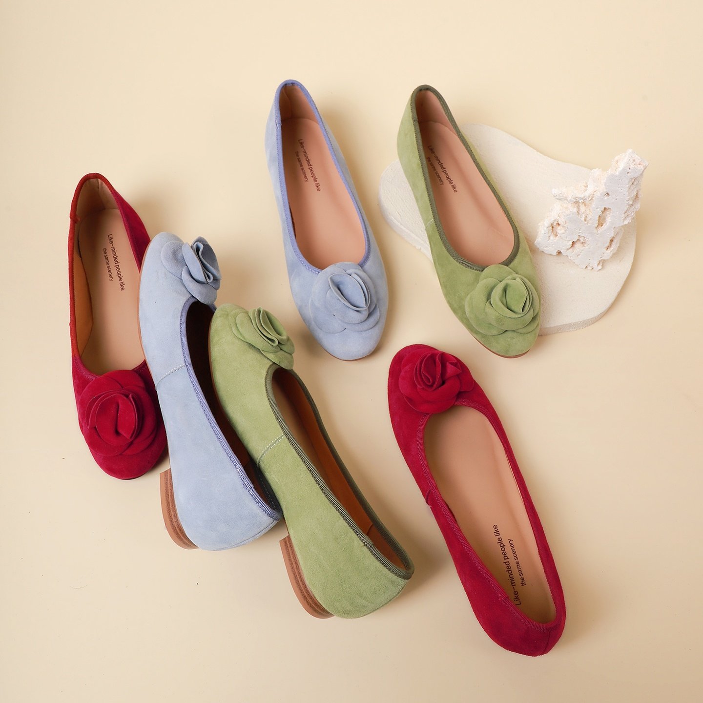 小羊皮中式绿色玫瑰花朵浅口平底单鞋女2026新款一脚蹬百搭通勤鞋