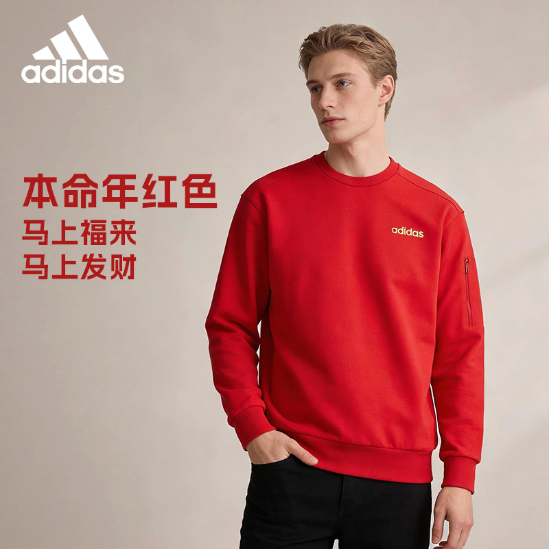 阿迪达斯红色卫衣男装冬季新款新年圆领打底宽松上衣运动服JM9095