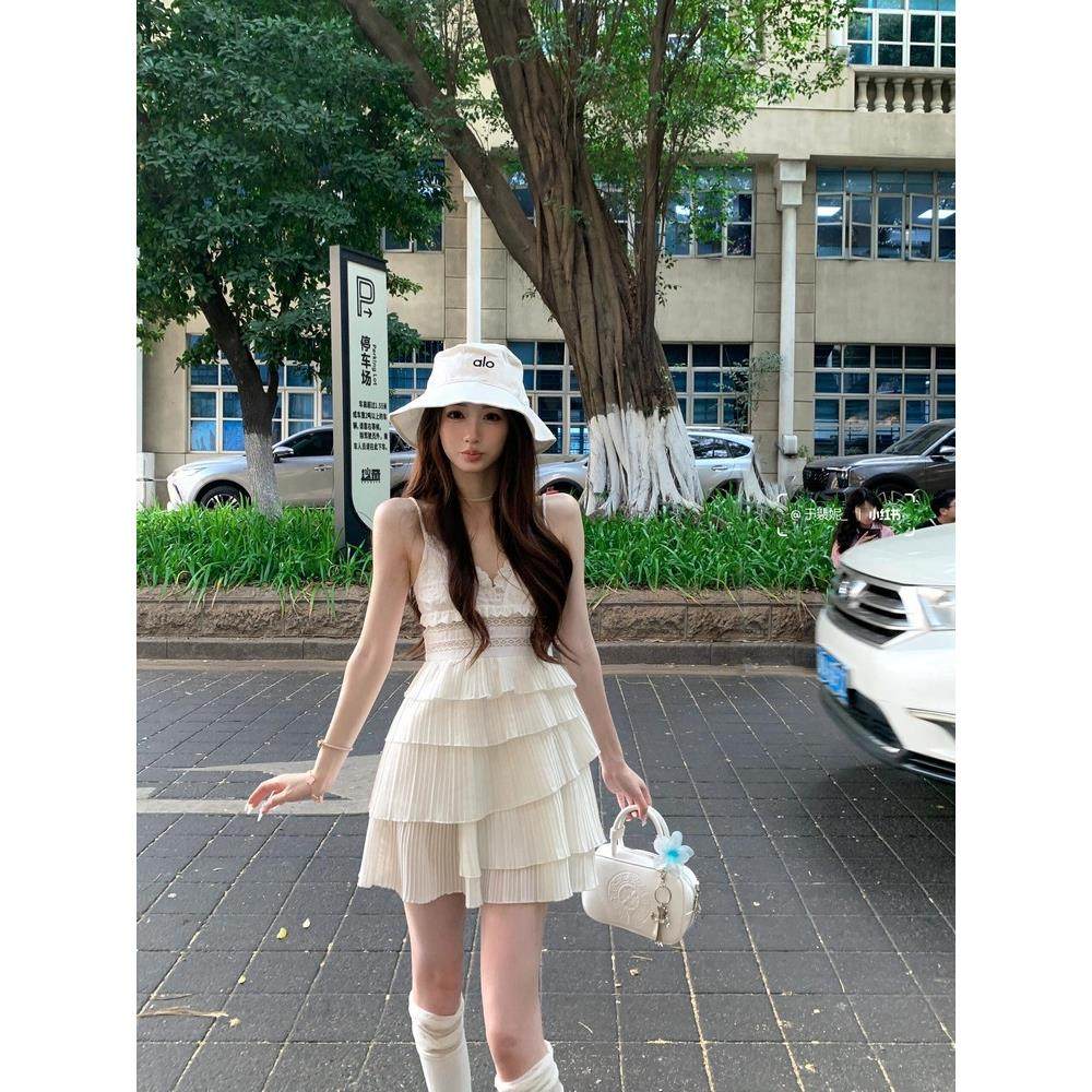白色V领吊带连衣裙女夏季纯欲风性感辣妹小个子修身显瘦包臀短裙