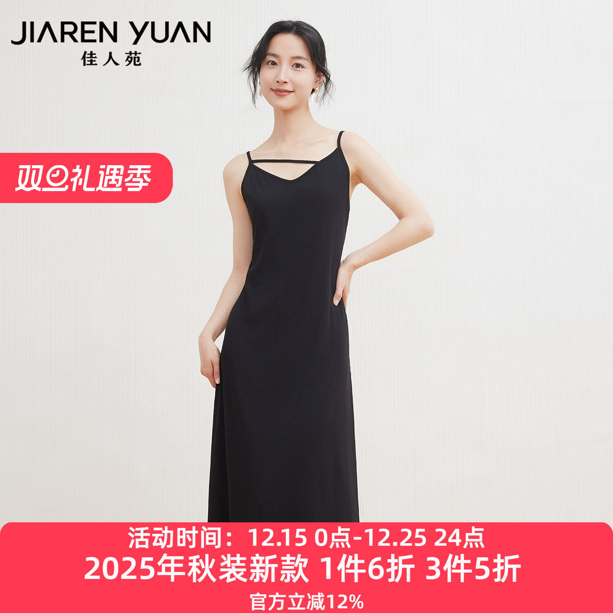 佳人苑连衣裙女2025年秋季新款V领领口包边A字吊带连衣裙修身显瘦