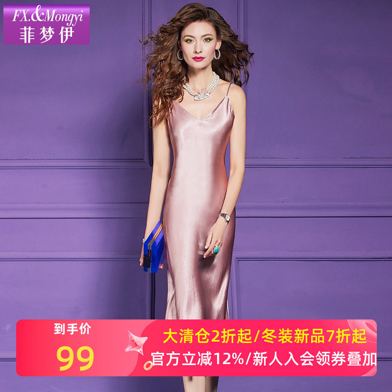 菲梦伊丝滑缎面吊带连衣裙女夏装法式轻奢性感女人味修身V领长裙