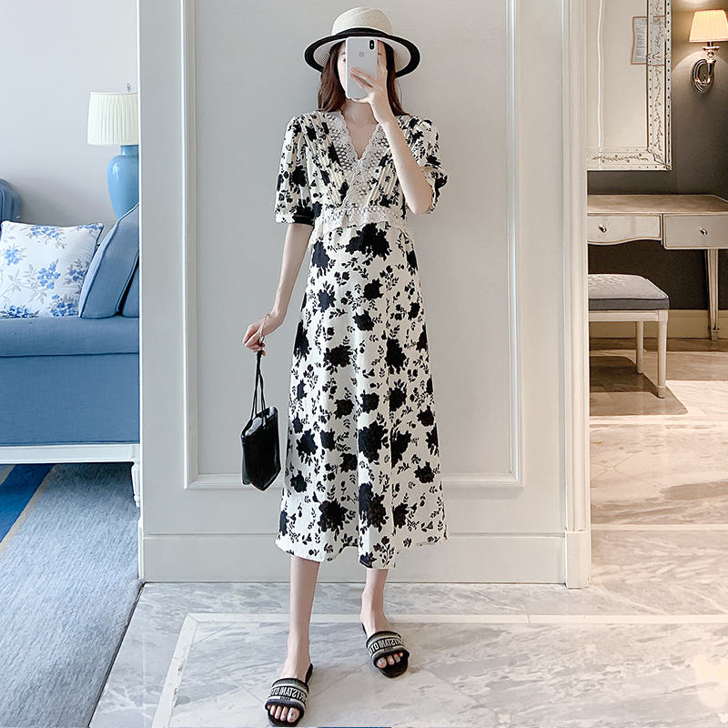 孕妇装夏装2022新款高级感宽松V领短袖雪纺碎花中长款孕妇连衣裙