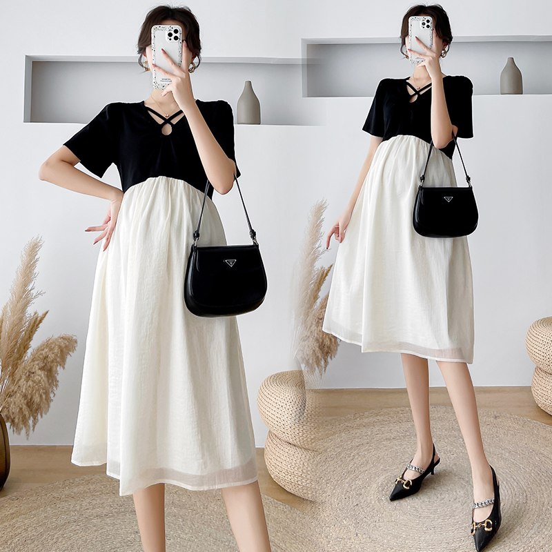 孕妇装连衣裙韩版夏季短袖雪纺拼接裙夏季时尚圆领薄款辣妈中长裙
