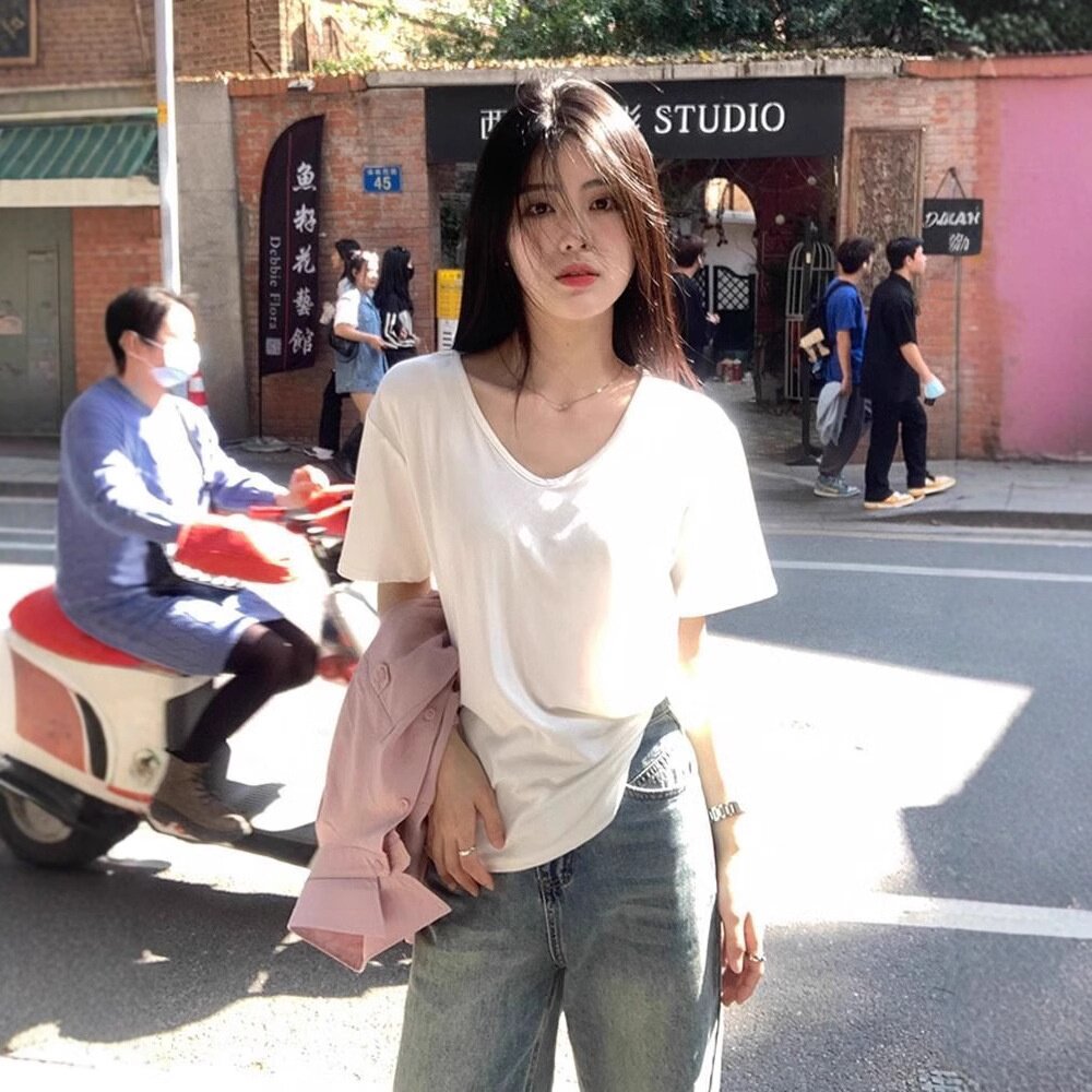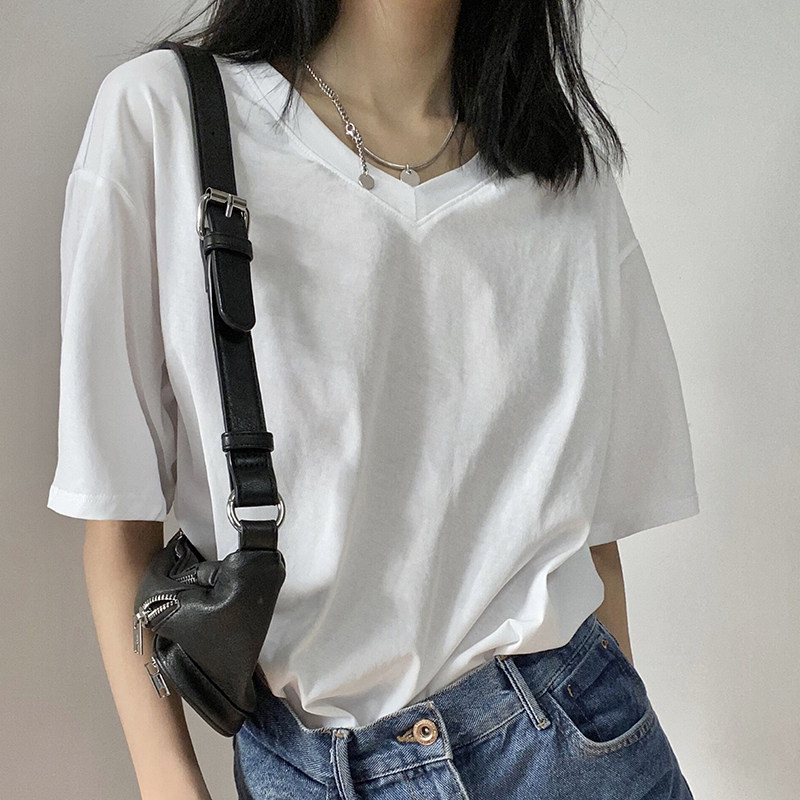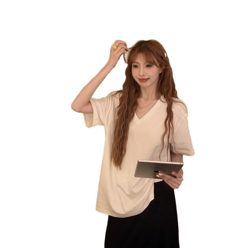 白色纯棉短袖T恤女春夏纯色V领磨毛打底衫宽松内搭学生慵懒风上衣