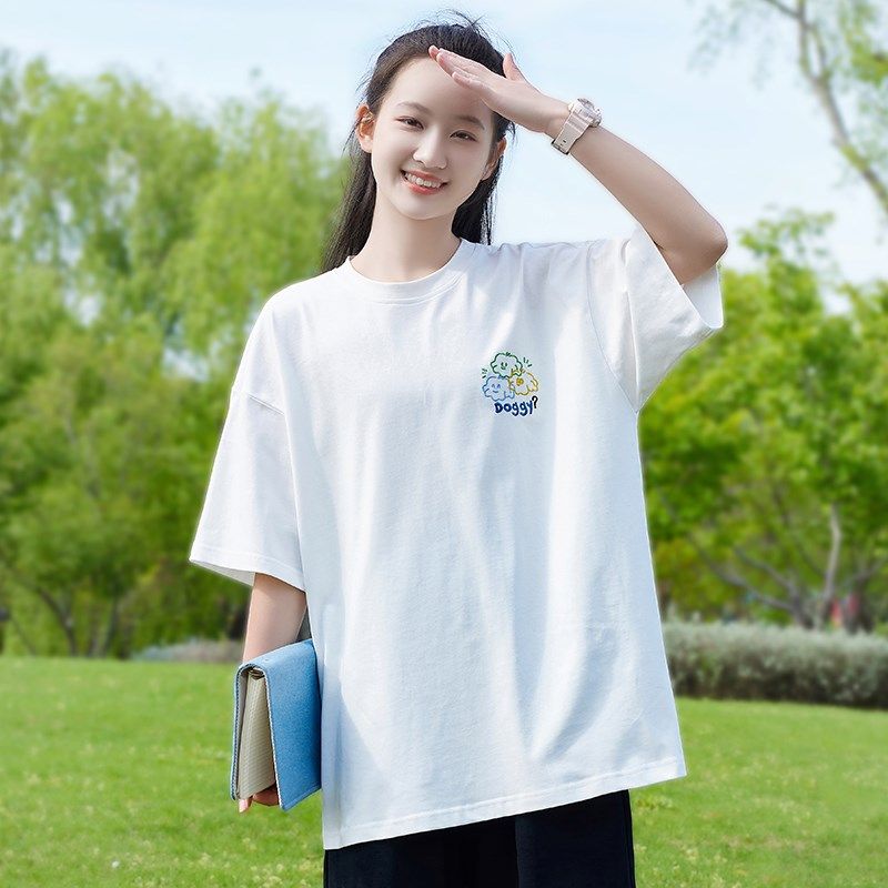 少女初中学生短袖t恤纯棉夏装13岁高中生落肩袖上衣宽松体恤纯色