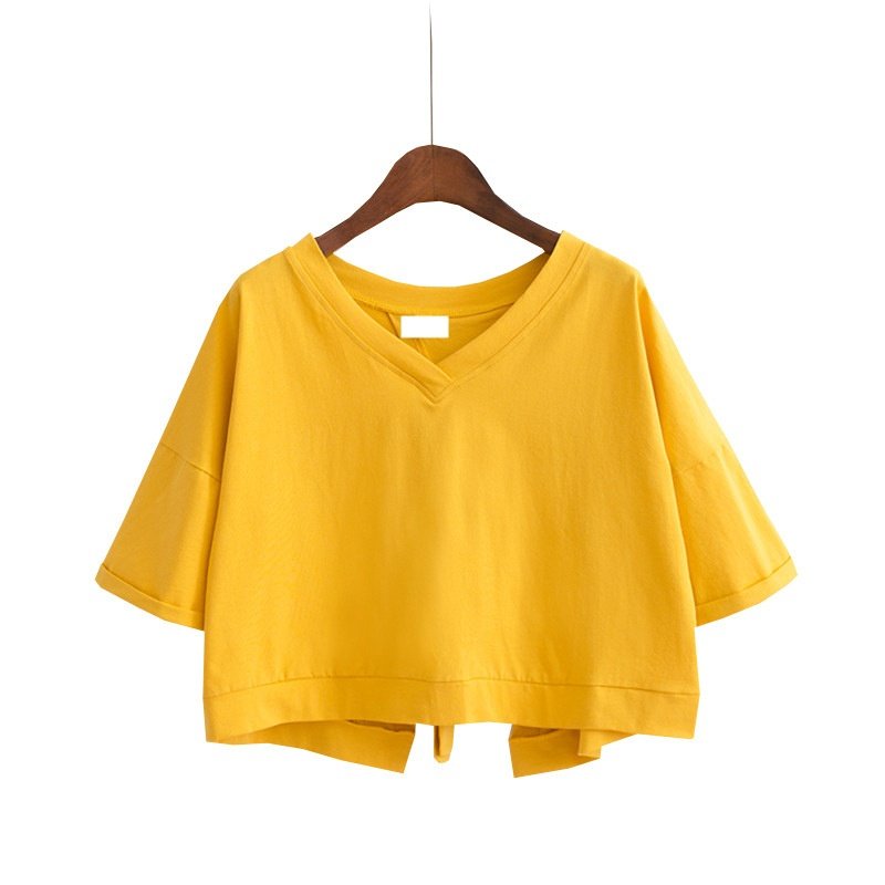 2025夏季纯色露背拼接开叉V领宽松短款上衣女学生绑带短袖T恤女装