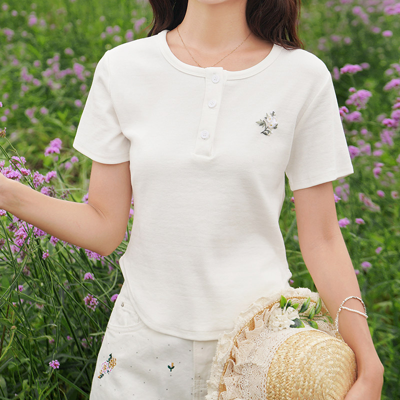 短袖韩版圆领t恤女2025夏季宽松植物印花休闲纯色学生半袖上衣潮