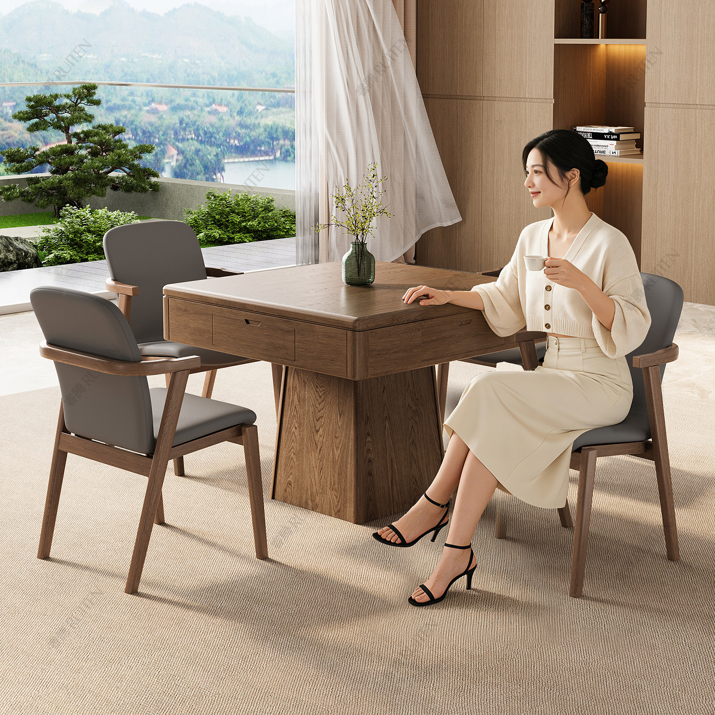 睿腾2025新款实木麻将机全自动家用麻将桌餐桌两用多功能中古风