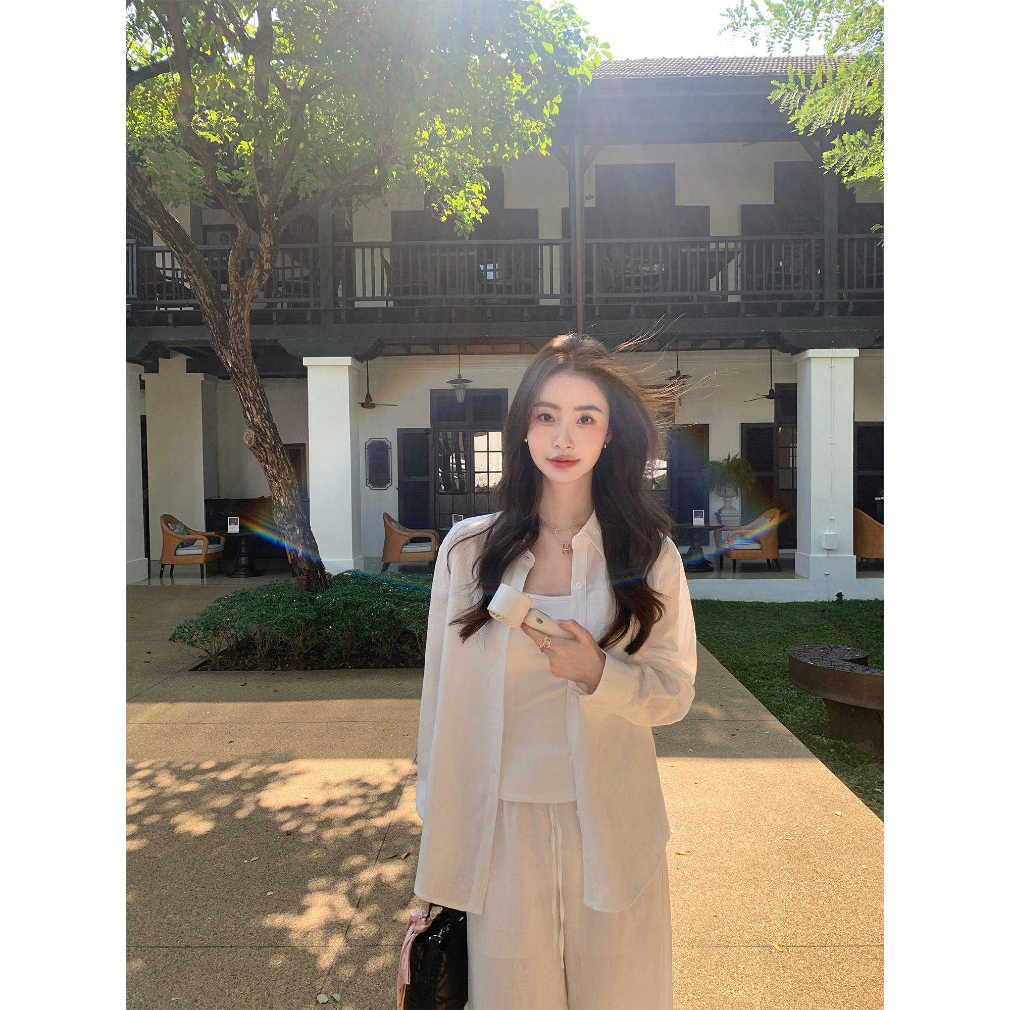 pusumede 不费力穿搭 莱赛尔亚麻长袖白衬衫女宽松阔腿休闲裤套装