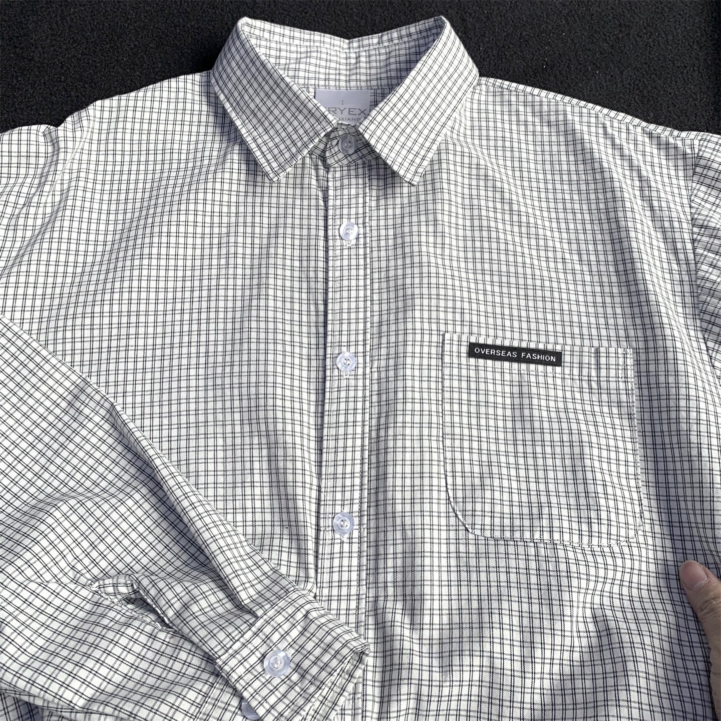 春季新款日系格子长袖衬衫男休闲翻领气质感白色衬衣女宽松上衣潮