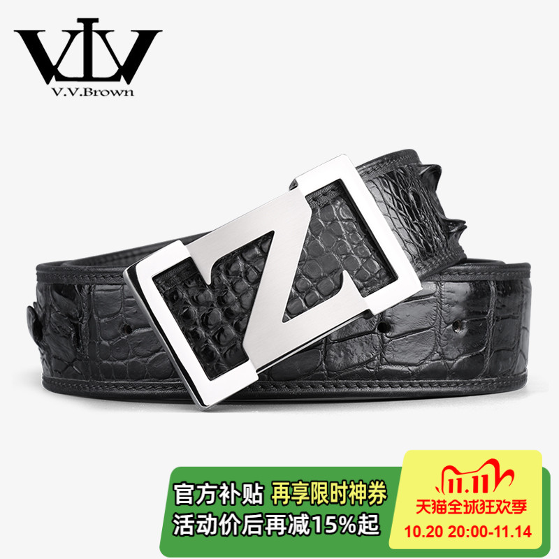 V.V.Brown正品鳄鱼皮皮带男不锈钢平滑字母Z扣商务中青年裤腰带男