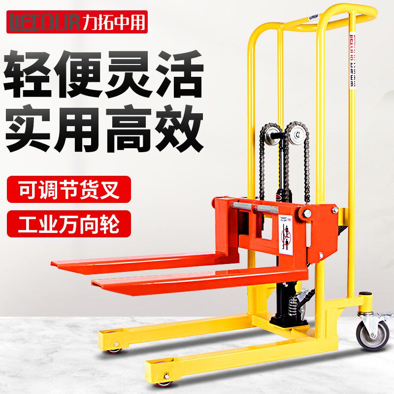 力拓中用 轻便型手动液压堆高车装卸升高叉车升降小型家用万向轮