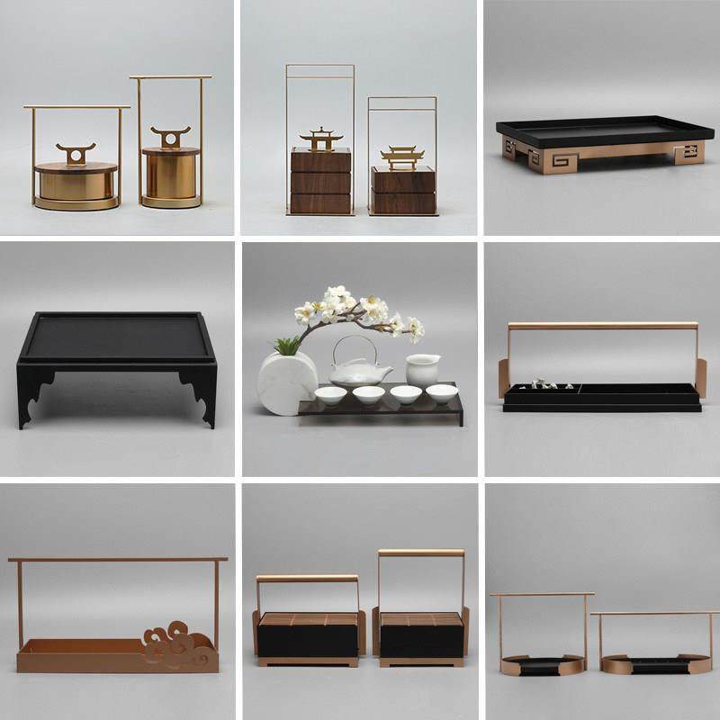现代新中式金属提篮摆设托盘铁艺摆件底座家居客厅茶几提盒装饰品