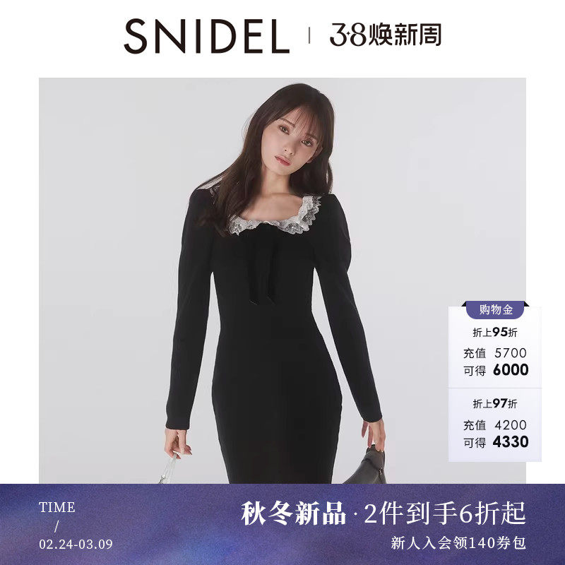 SNIDEL2025秋冬新品蕾丝方领长袖收腰短款针织连衣裙SWNO255175