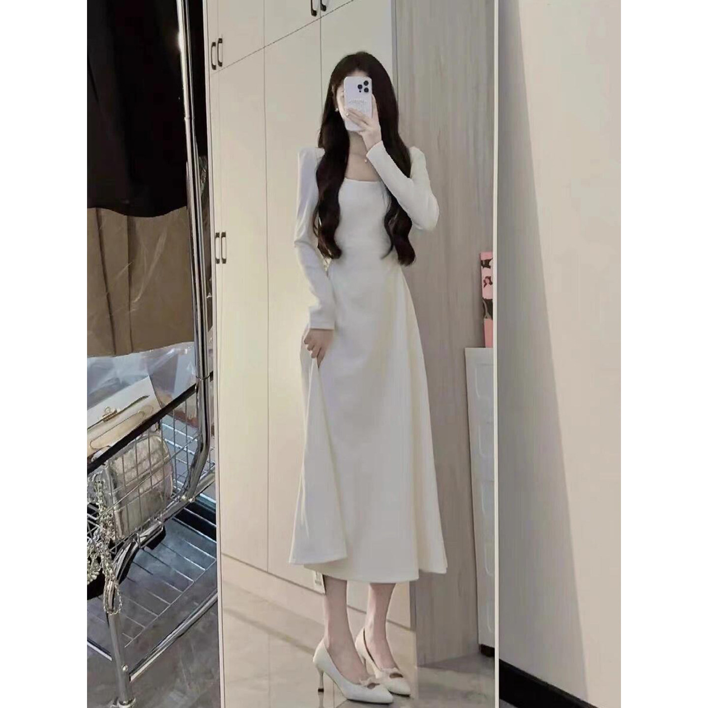 白色长袖连衣裙女收腰秋冬季小个子打底方领小白裙生日裙子高级感