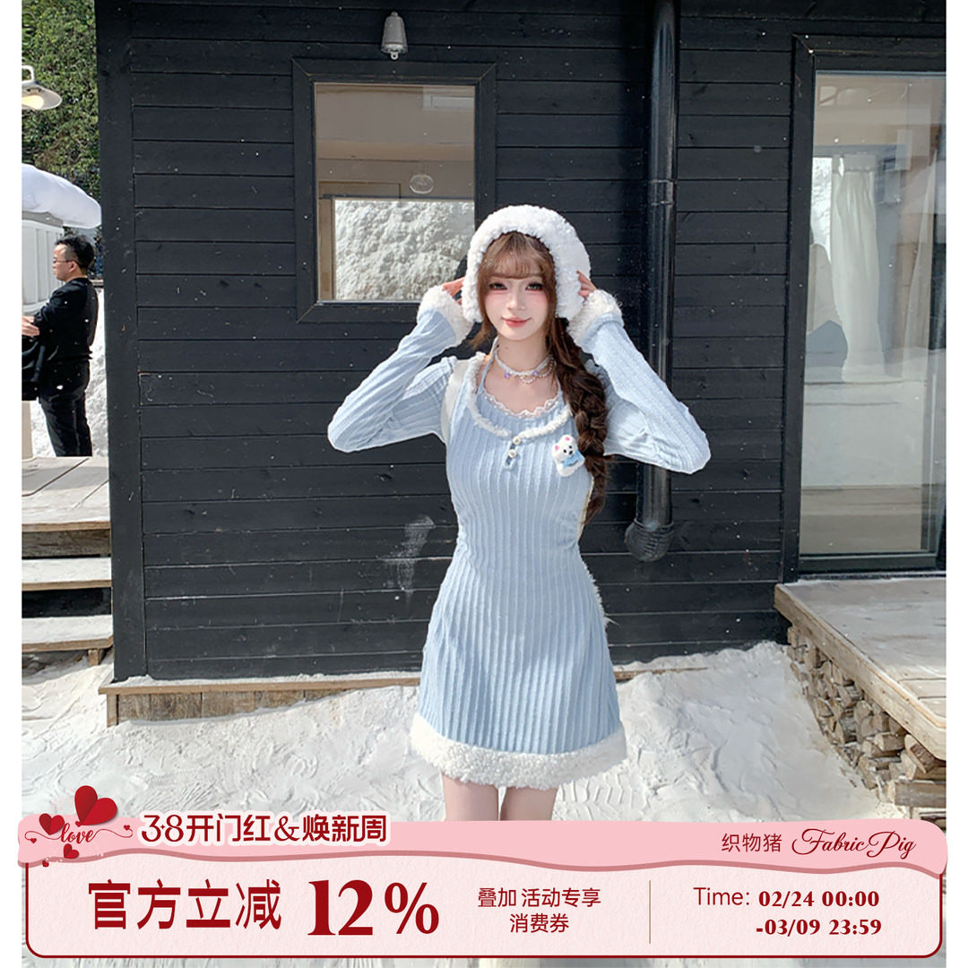 织物猪 夹心泡芙 甜欲风蓝色针织长袖连衣裙女秋冬穿搭毛衣短裙子