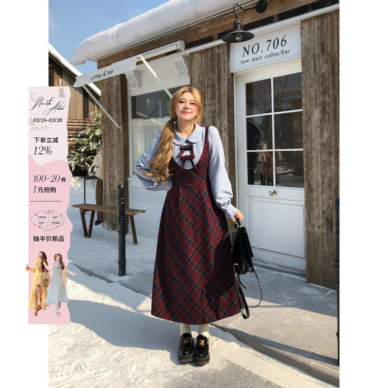 安妮不火 格纹假两件连衣裙女2025秋冬新款微胖大码长袖收腰裙子