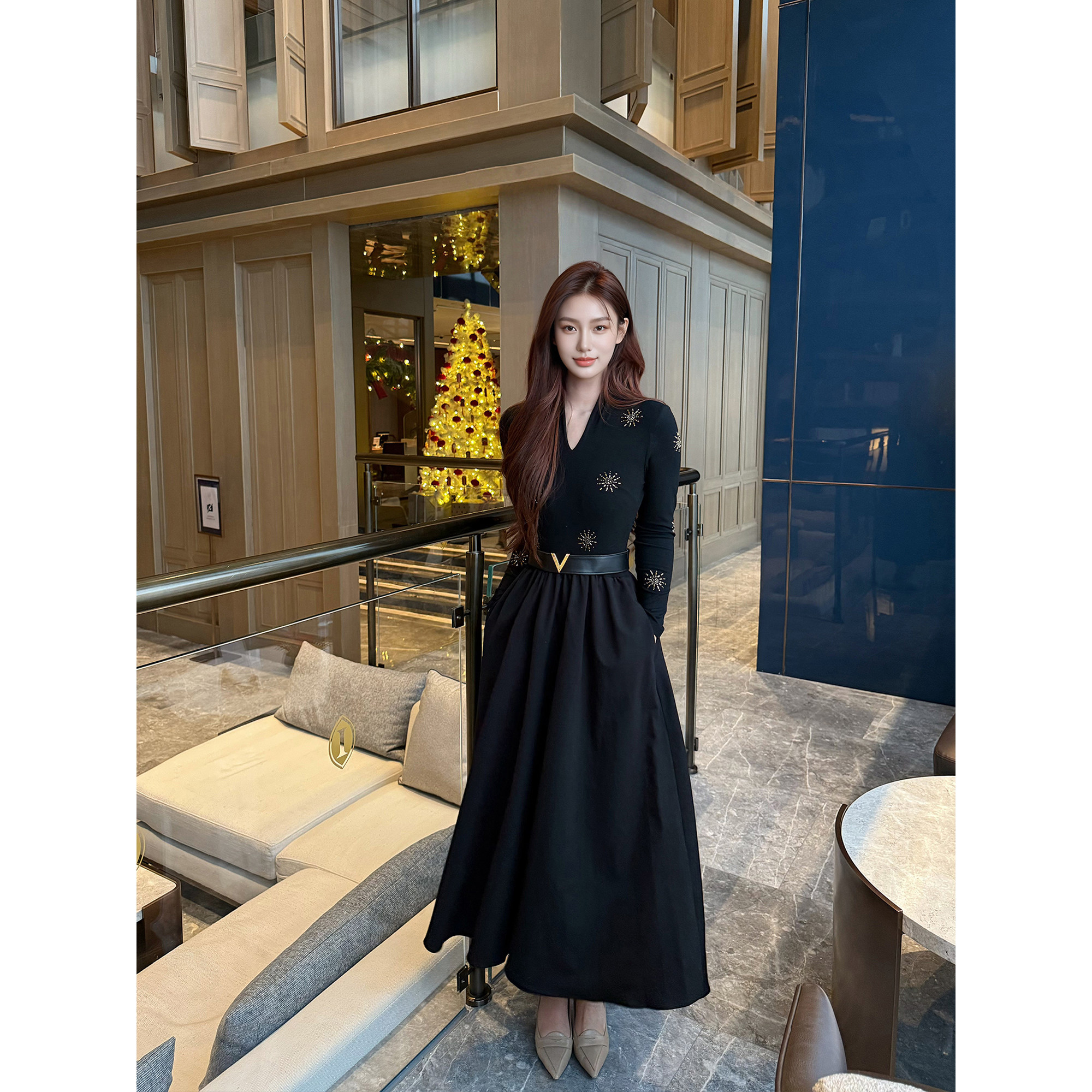 GEMQI V领烫钻花朵针织长裙重工长袖连衣裙 秋冬内搭晚宴派对战袍