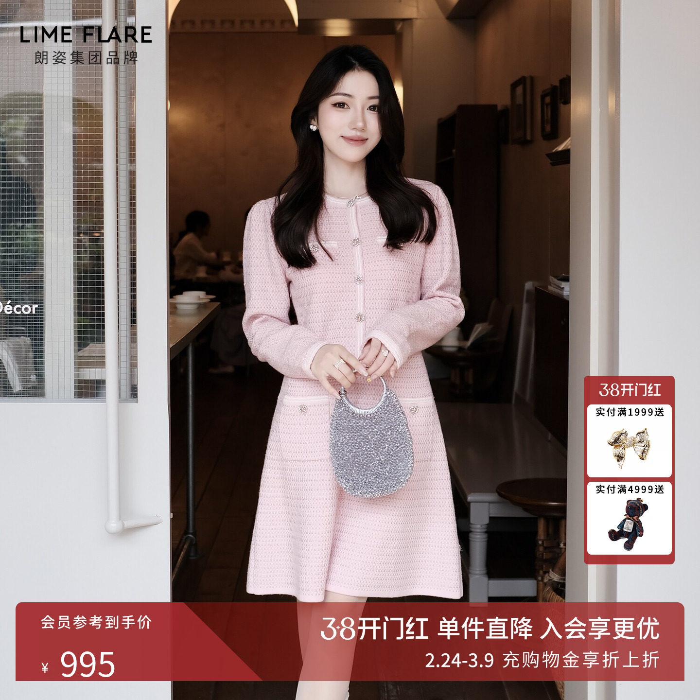 莱茵福莱尔2025秋冬新款轻奢高级感长袖钻扣法式粉色针织连衣裙女