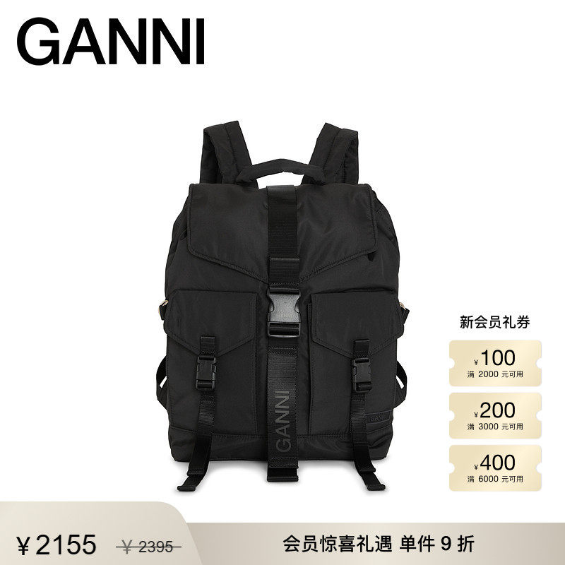 【明星同款】GANNI女包 黑色logo简约双肩包旅行包背包 A4755099