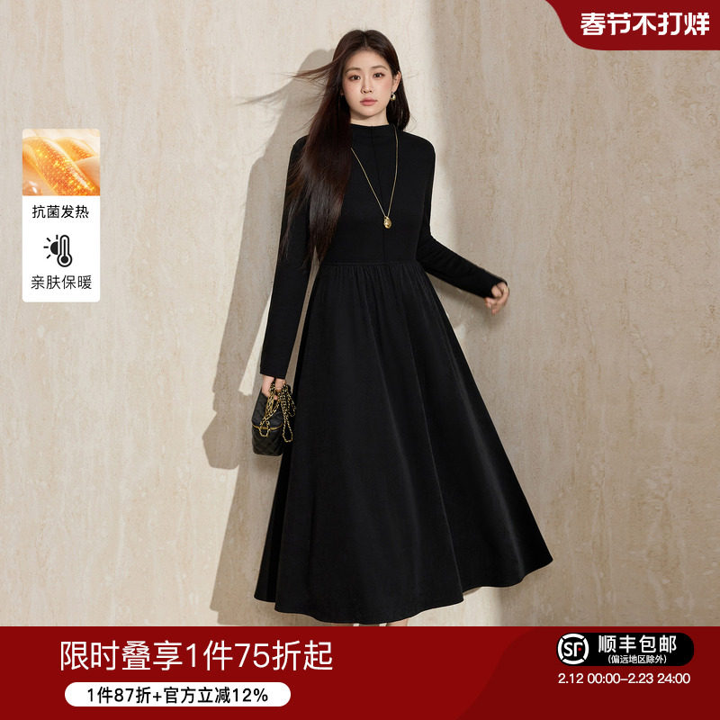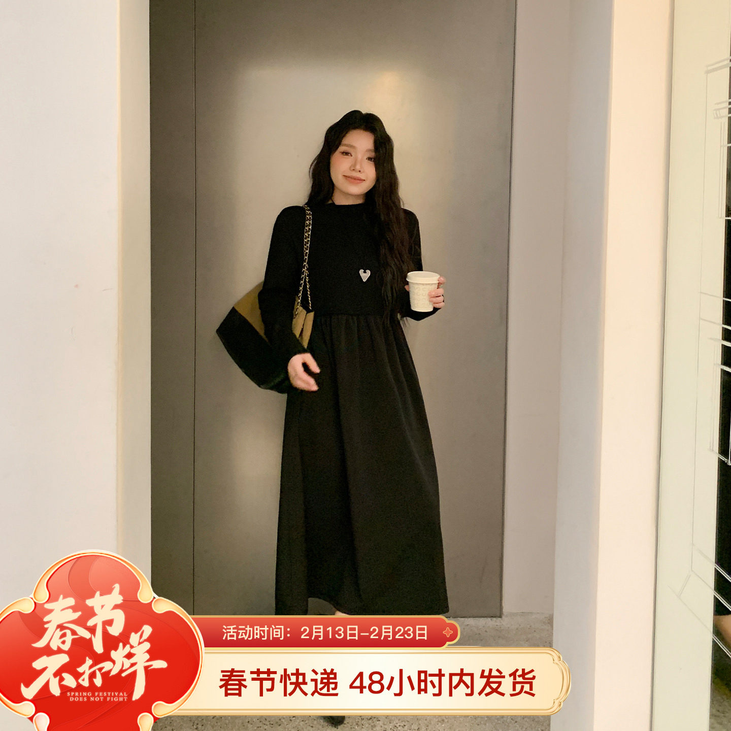 蓝语大码女装赫本风气质收腰针织拼接连衣裙2025秋冬新款黑色长裙