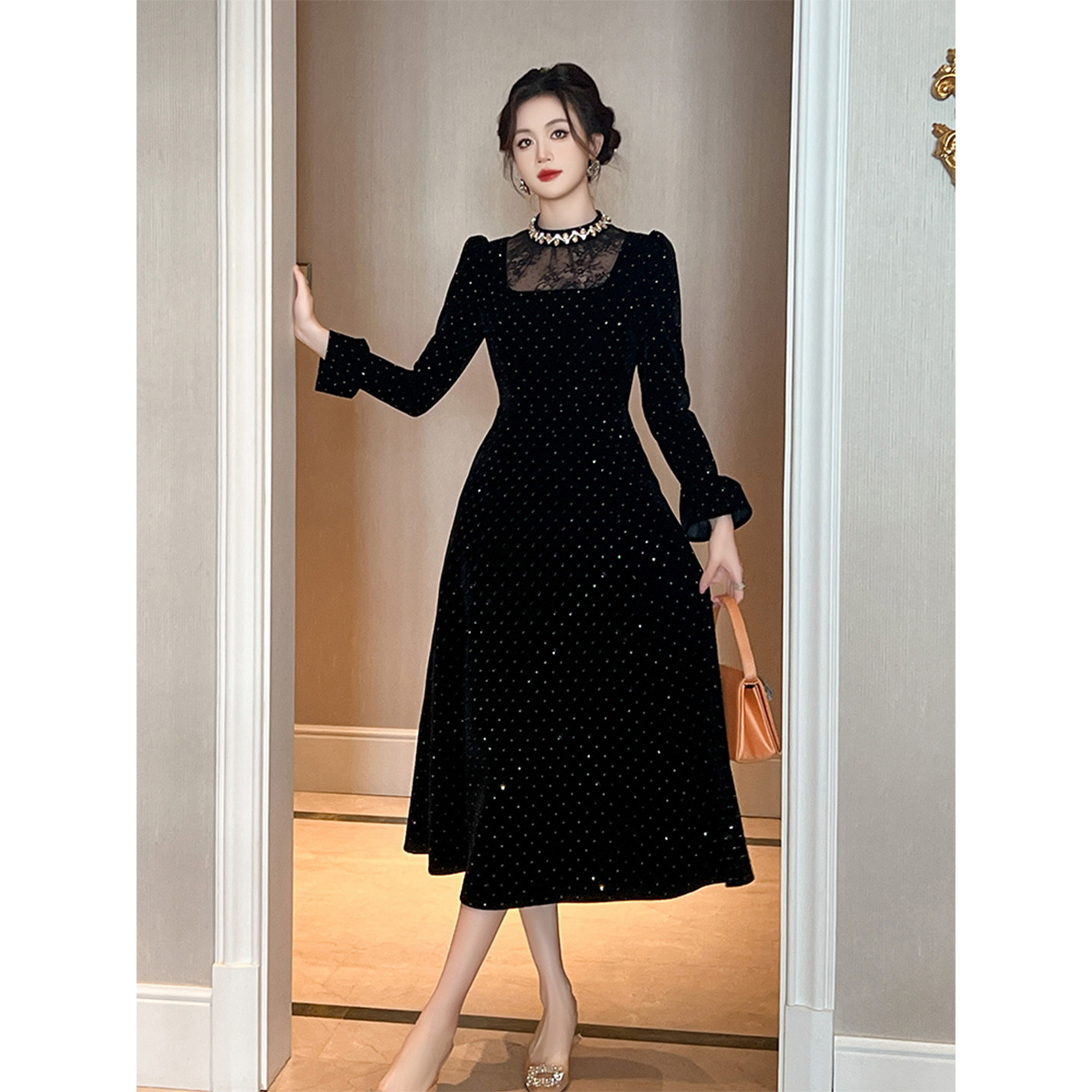 大码女装法式赫本风蕾丝拼接连衣裙女秋冬高级感长袖气质丝绒长裙