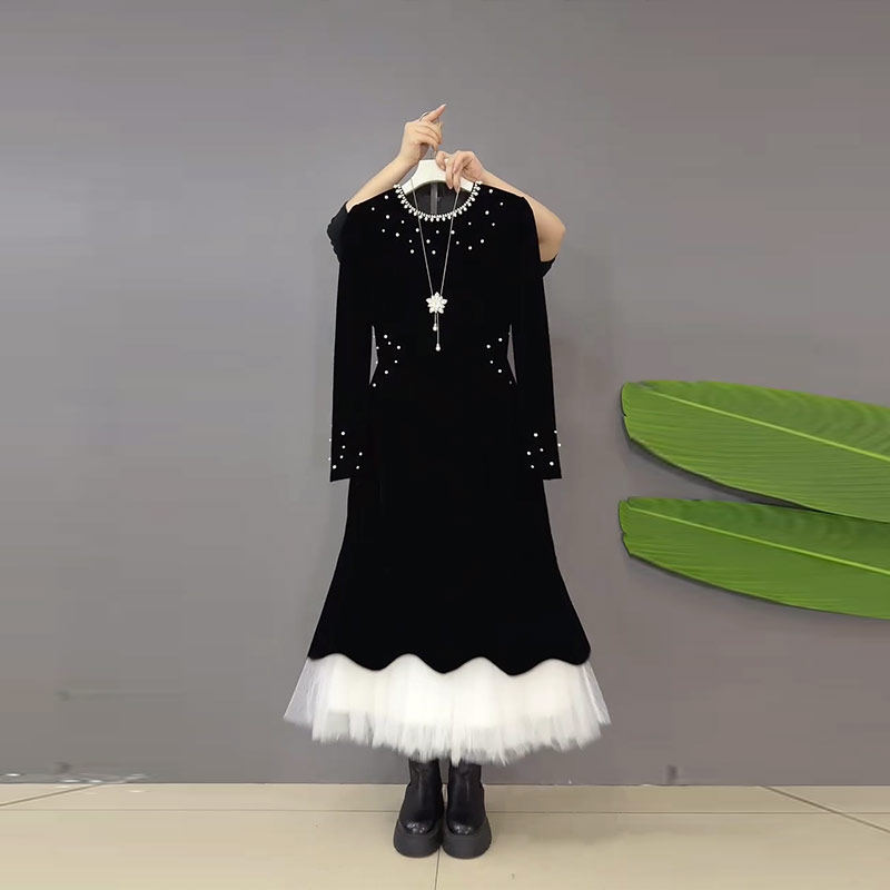 大码女装拼色网纱裙摆收腰长袖连衣裙法式气质赫本风长款洋气裙子