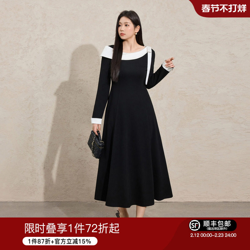 蓝语大码法式赫本风黑白撞色连衣裙2026春季新款一字领收腰小黑裙