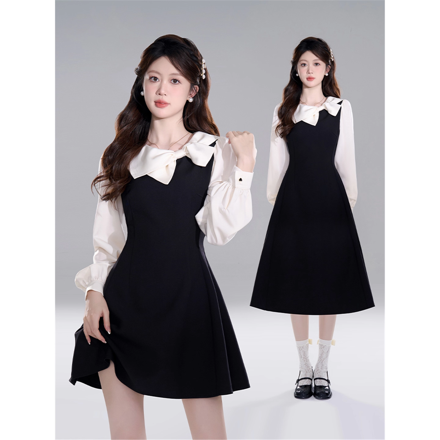 秋冬新款法式假两件赫本风时尚长袖polo大码收腰显瘦设计感连衣裙