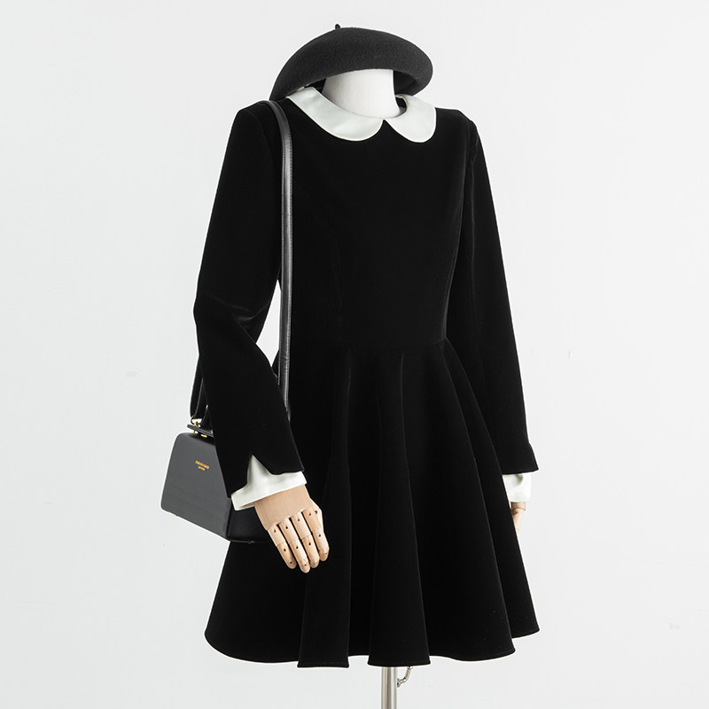 爵莱菲大码赫本风撞色娃娃领丝绒连衣裙女装秋冬新款气质短裙高腰