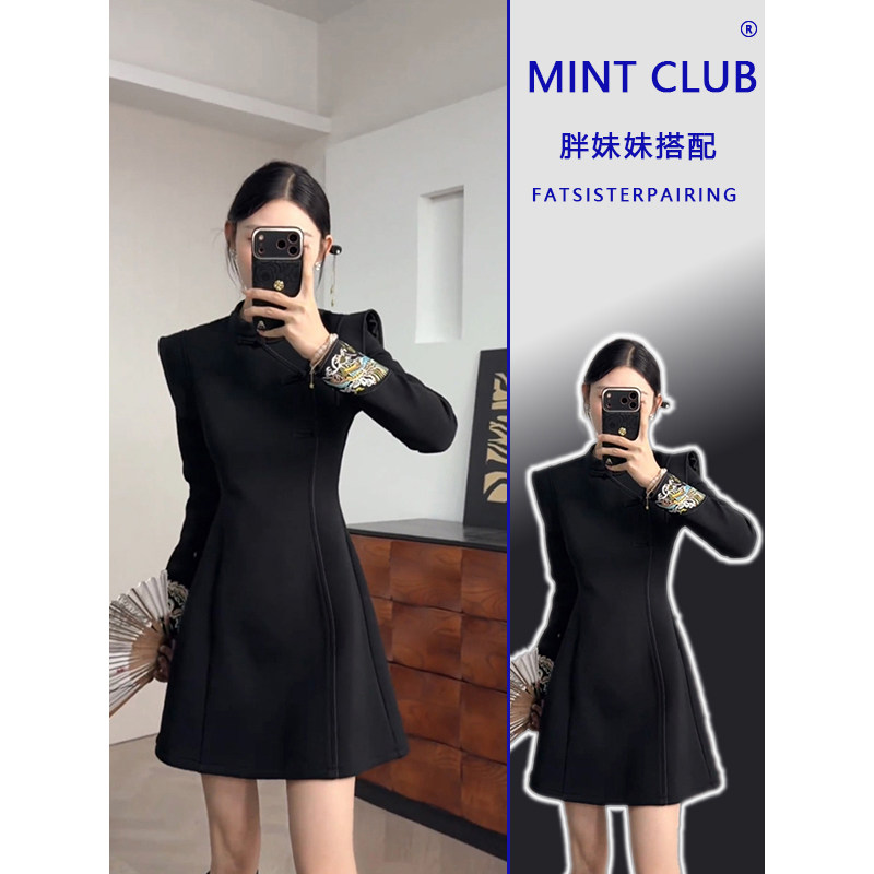 大码胖MM赫本风立领刺绣开叉黑色连衣裙女春季新中式收腰显瘦裙子