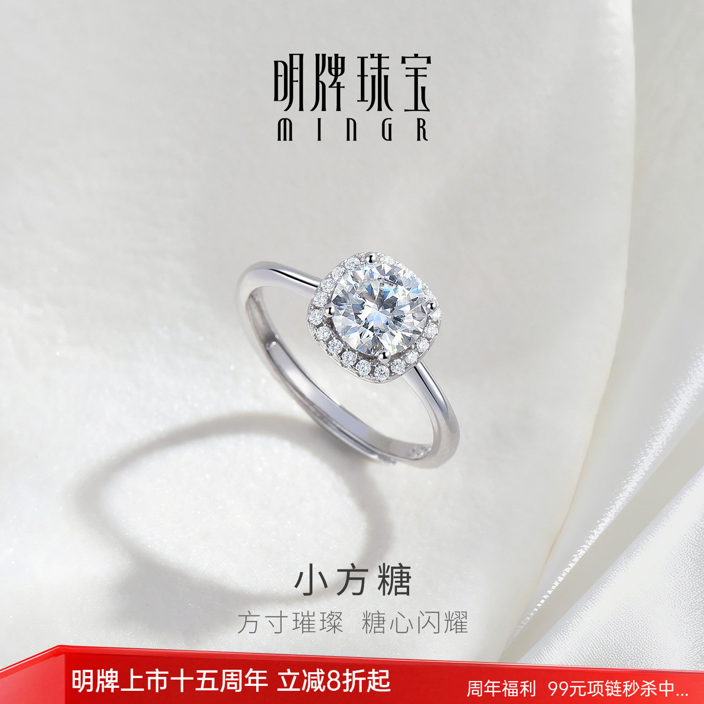 明牌珠宝小方糖925银戒指锆石镶嵌闪亮高级几何活口女戒指环礼物