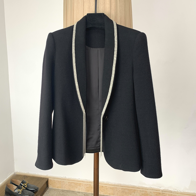 【断码特价】法式羊毛毛呢黑色西装女高级流苏设计感气质修身外套