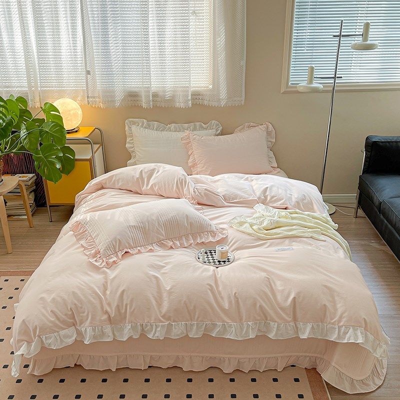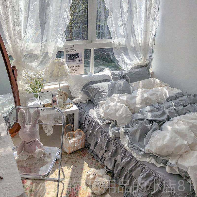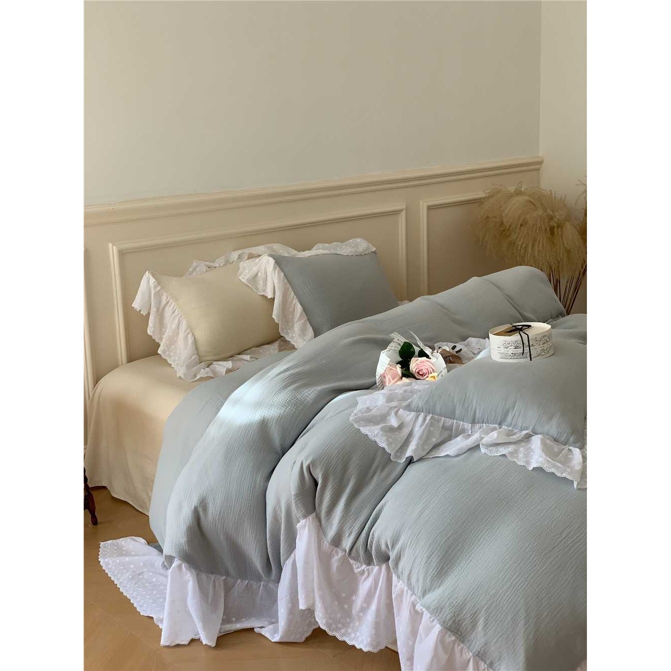 韩国轻柔皱皱纱四件套轻奢田园风大花边超柔裸睡床单被套床上用品