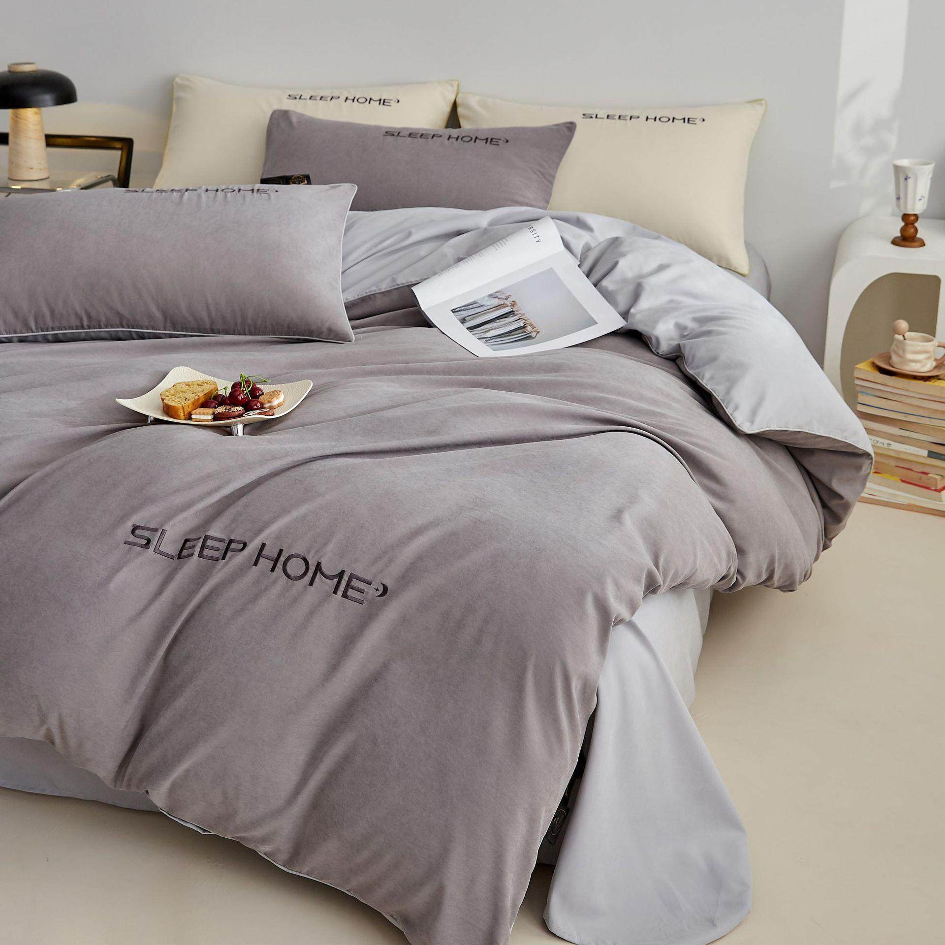 出口韩国秋冬宝宝绒五件套古法水洗仿原麻床上用品加绒布袋四件套