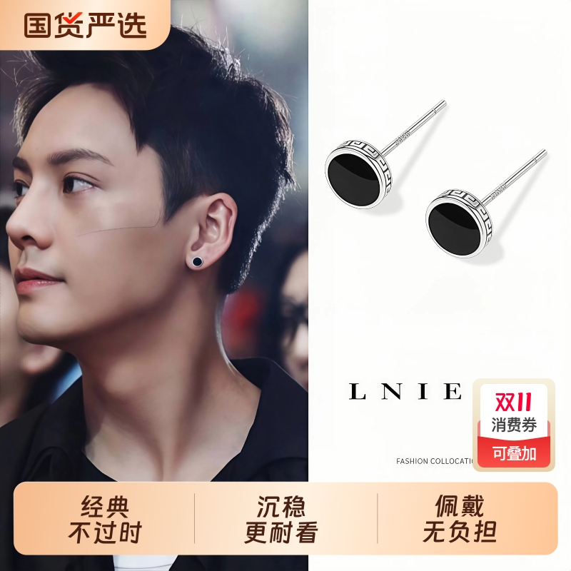 925纯银养耳洞天然黑玛瑙耳钉男个性潮流痞帅耳环2025新款潮耳饰