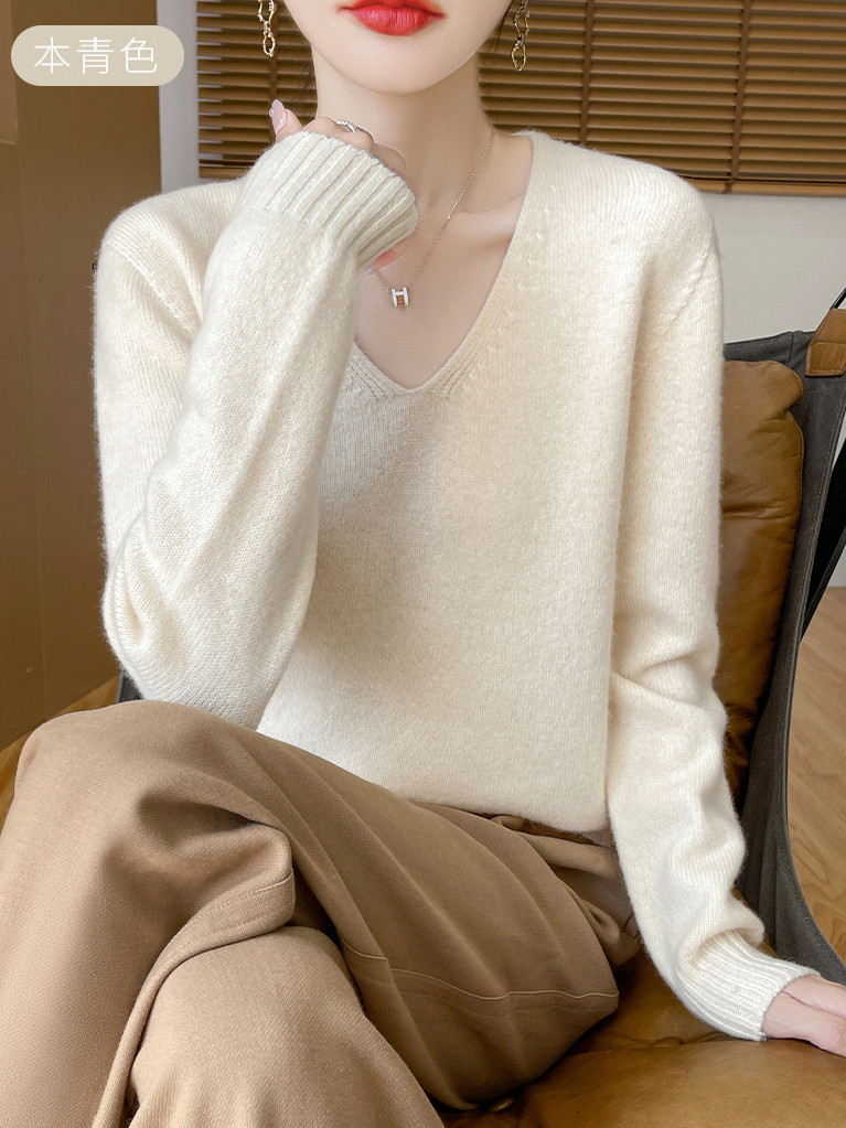 秋冬款100%纯羊毛衫套头百搭V领毛衣女士长袖一线成衣打底针织衫