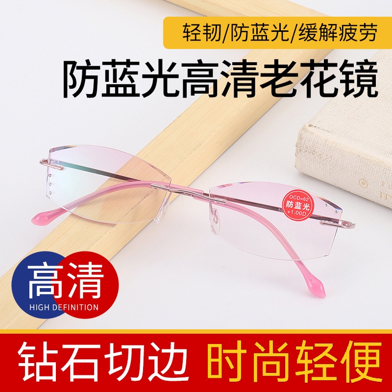 高清女式老花眼镜钻石无框切边防蓝光抗疲劳眼镜超轻时尚优雅高档