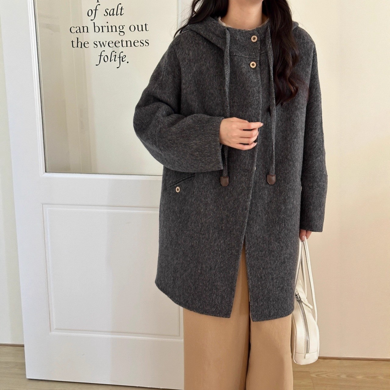 dfvc韩版中长款羊毛呢外套女2025年冬季新款连帽宽松双面呢子大衣