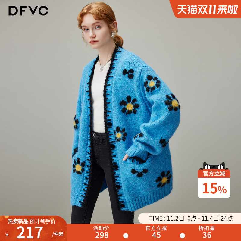 dfvc韩版羊毛中长款V领针织衫女2025年冬季新款花朵开衫毛衣外套