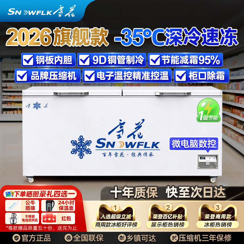 【热销】雪花卧式冰柜商用超市大容量冰箱冷藏冷冻保鲜双温柜冷柜