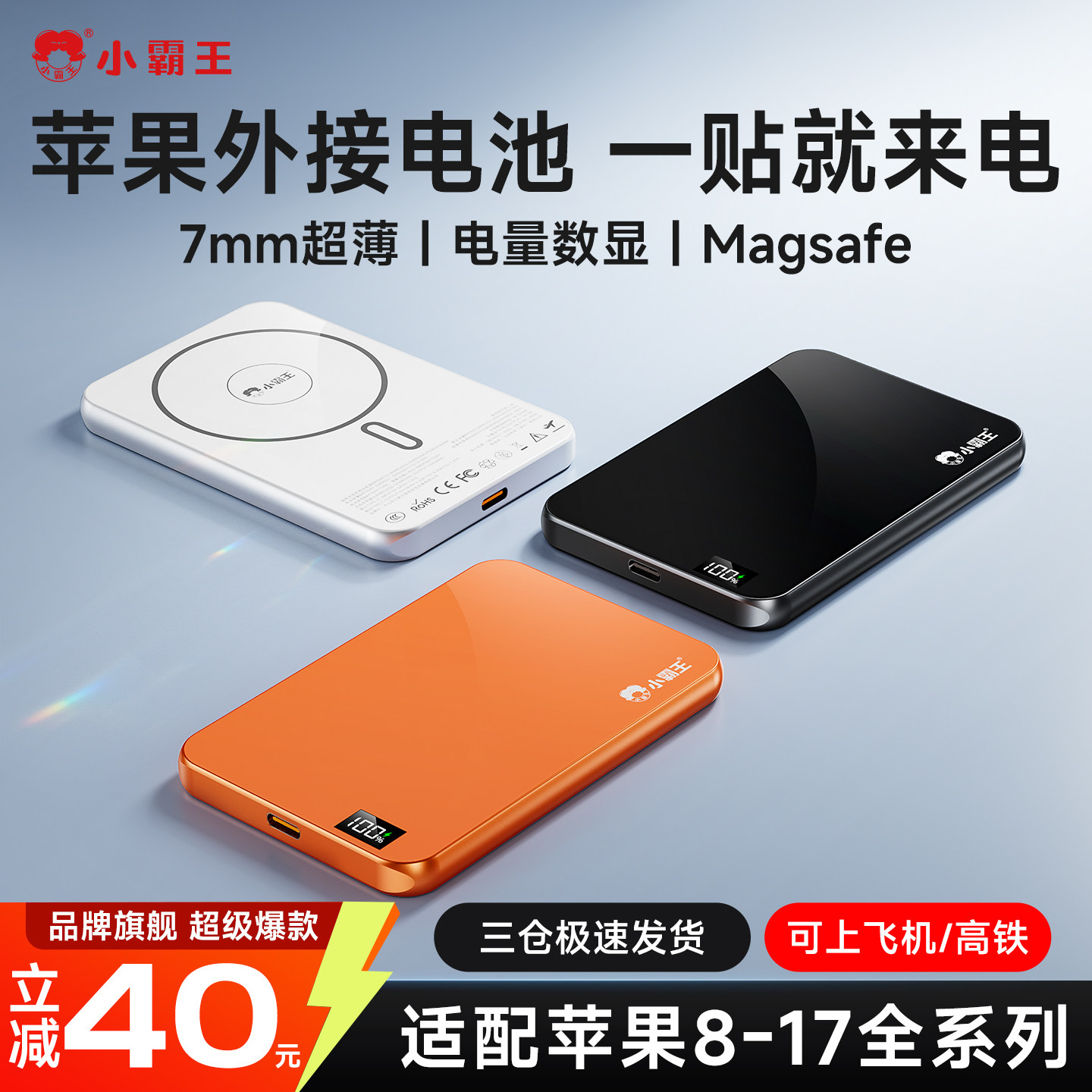 【7mm超薄】小霸王充电宝3c认证可上飞机快充大容量移动电源苹果磁吸充电宝无线充电宝苹果专用小米