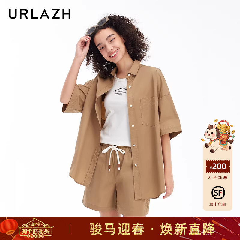 URLAZH有兰新款复古洋气纯棉休闲时尚慵懒风宽松纯色短袖衬衫女