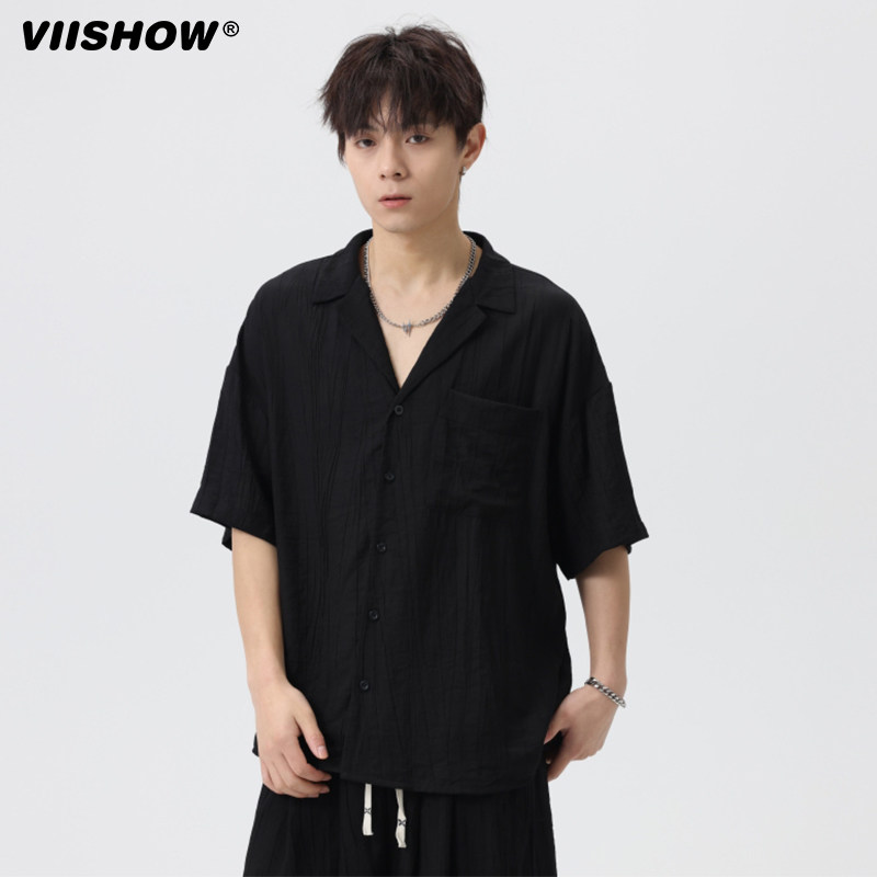 VIISHOW复古小众凹凸线条纯色短袖衬衫男潮牌街头宽松休闲衬衣服